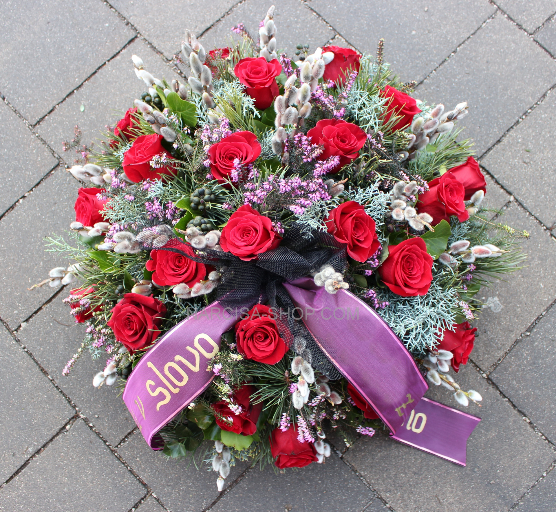 Bidermajer ikebana je sestavljena iz žametnih rdečih vrtnic, sezonskih dodatkov in izbranega zelenja.