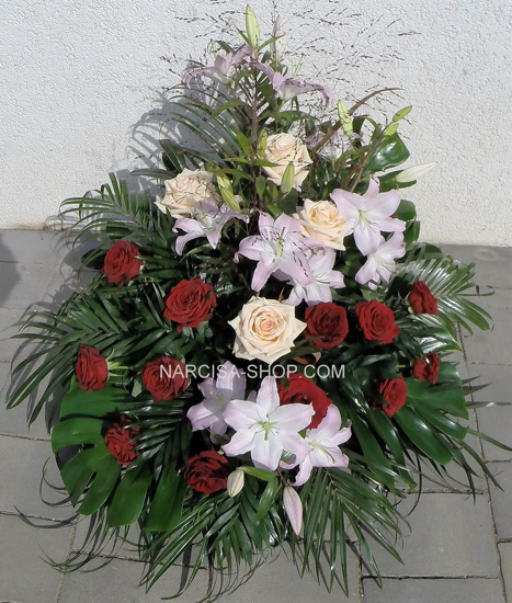 Ikebana je sestavljenaiz žametno rdečih vrtnic, lilij in vrtnic beš barve ter izpoplnjena z zelenjem.