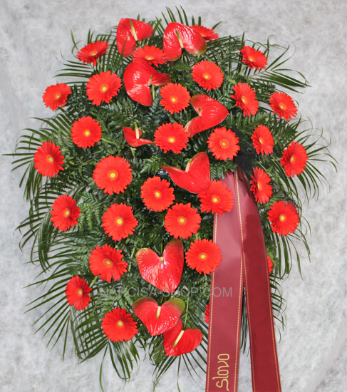 Žalni venec je sestavljen iz rdečih gerber in rdečih flamingov ki so elegantno zarobljeni z zeleno barvo