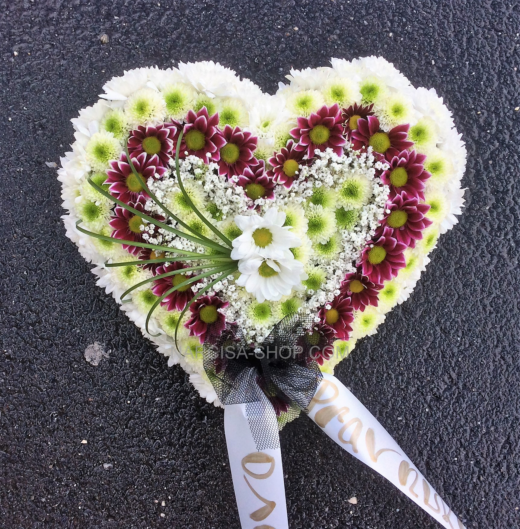 Srček je sestavljen iz belih krizantem, pisanih krizantem, gipsofile z dodatki okrasne trave.