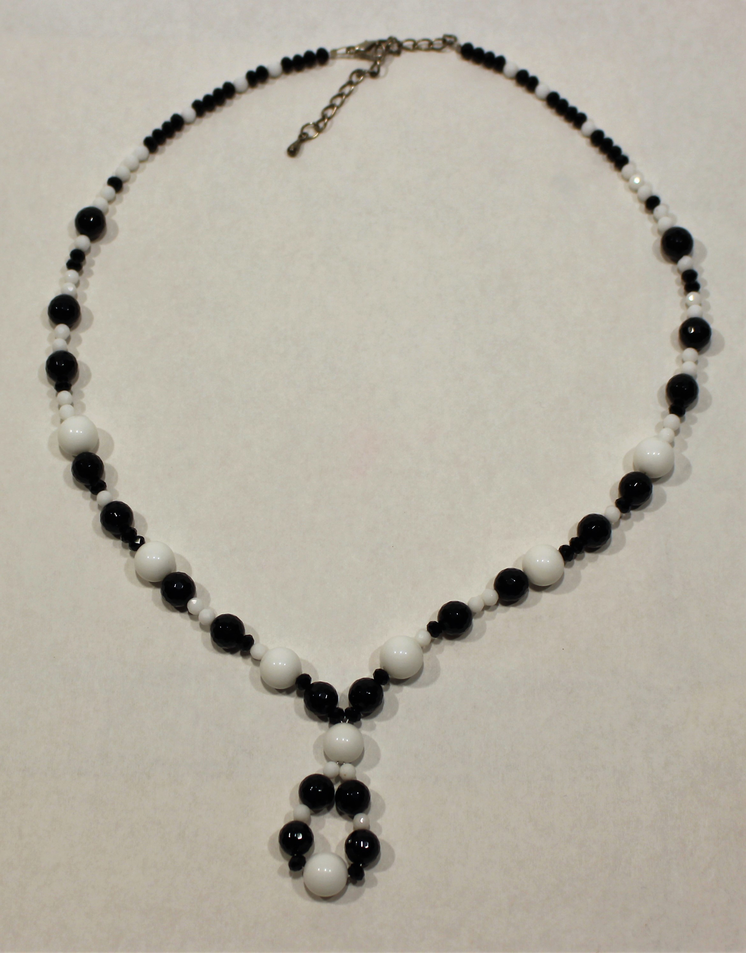 Ogrlica je sestavljena iz belih okroglih perlic in črnih brušenih perlic. Zapenja se z varnostnim karabinom.