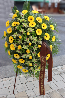 Žalni venec je sestavljen iz toplih sončnih barv, rumenih gerber, zelenih cvetoc cimbidium orhideje zelenimi santini krizantemami in dopolnjin z belim vaxsom.